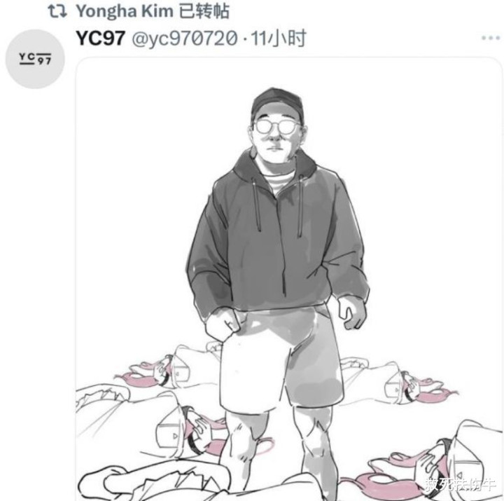 《蔚蓝档案》被入侵后,金用河还转发了“被迫加班”的梗图。